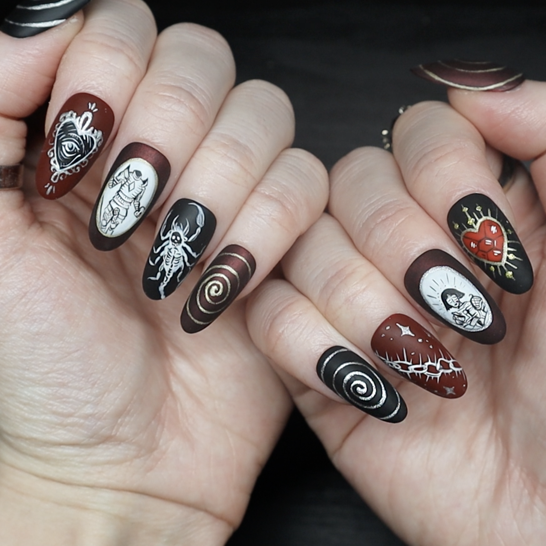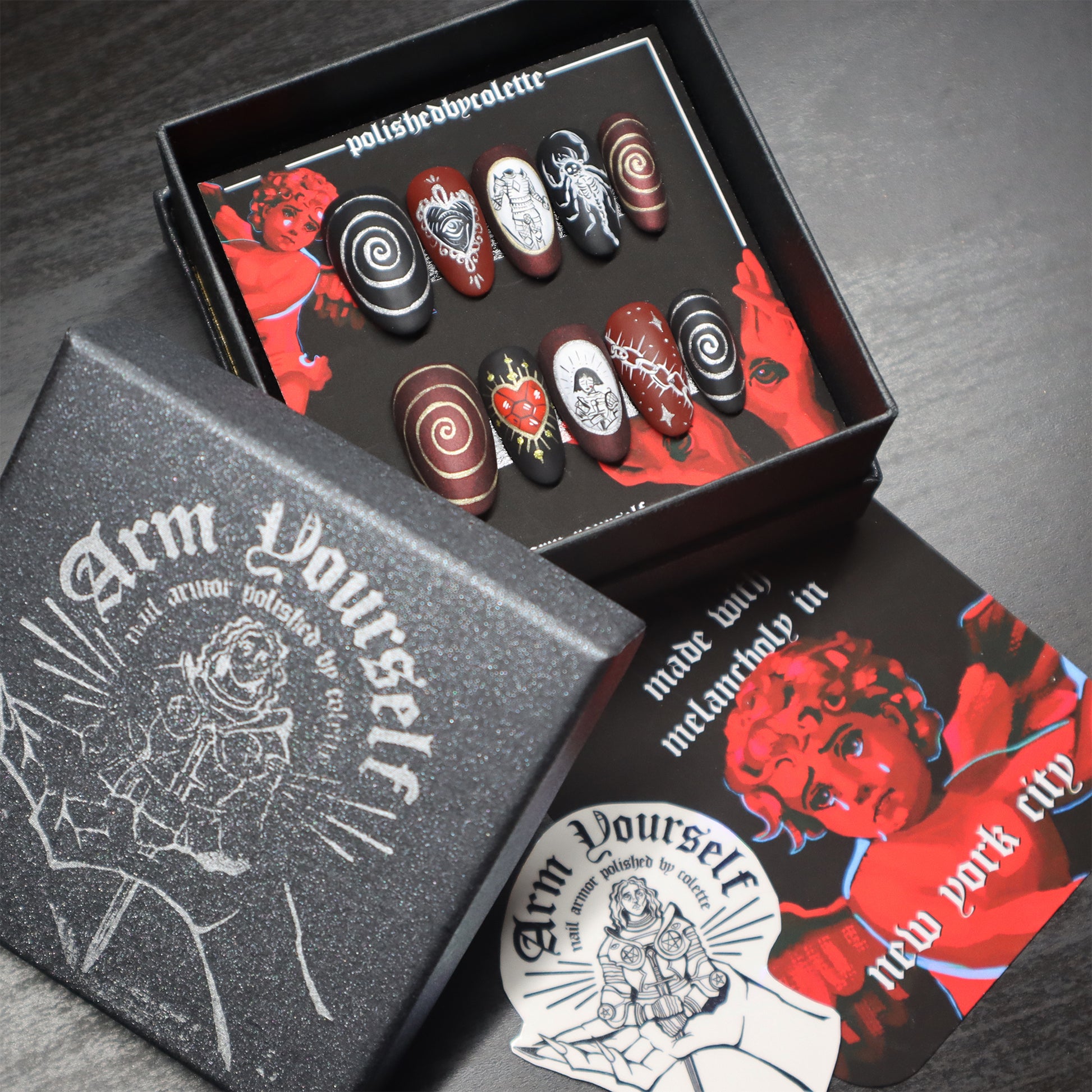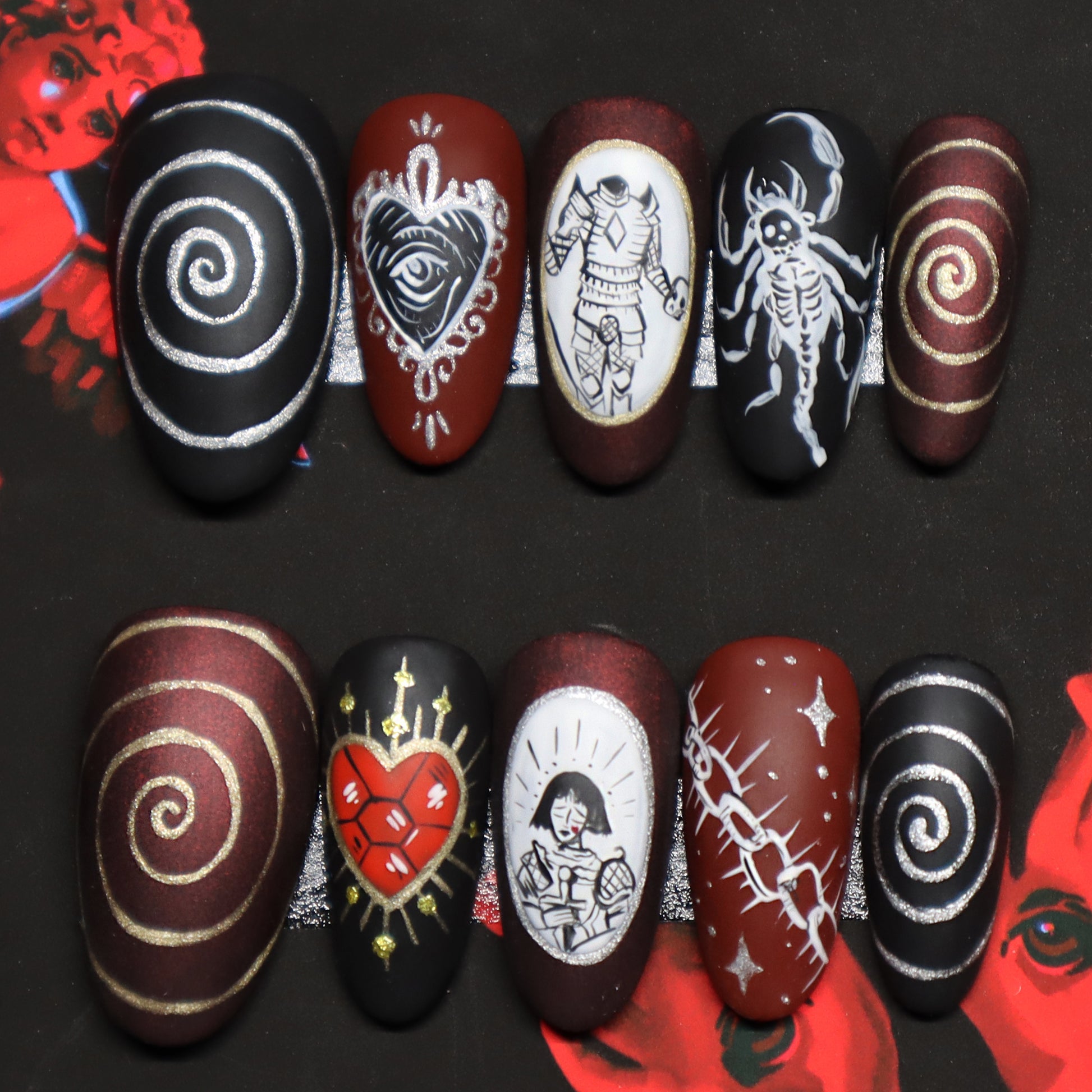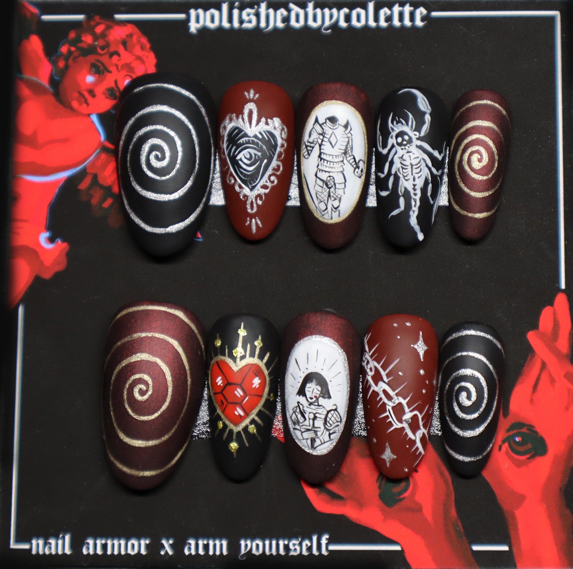 10 hand painted press on nails featuring knight, religious and martyr imagery. these nails are reusable and can be worn for days or weeks at a time depending on your preference.