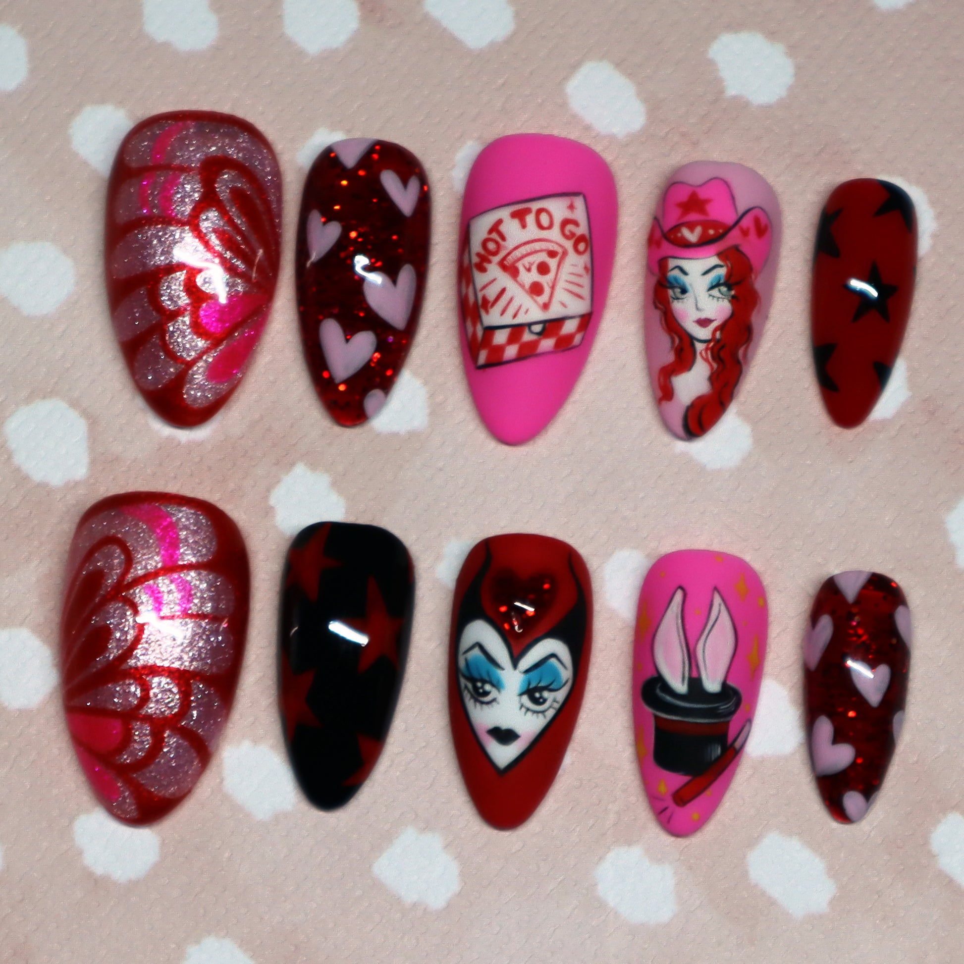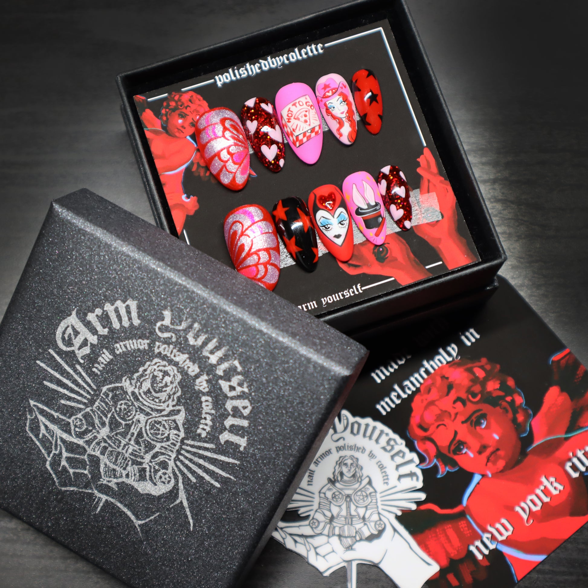 10 hand painted press on nails featuring religious and queer imagery. these nails are reusable and can be worn for days or weeks at a time depending on your preference.