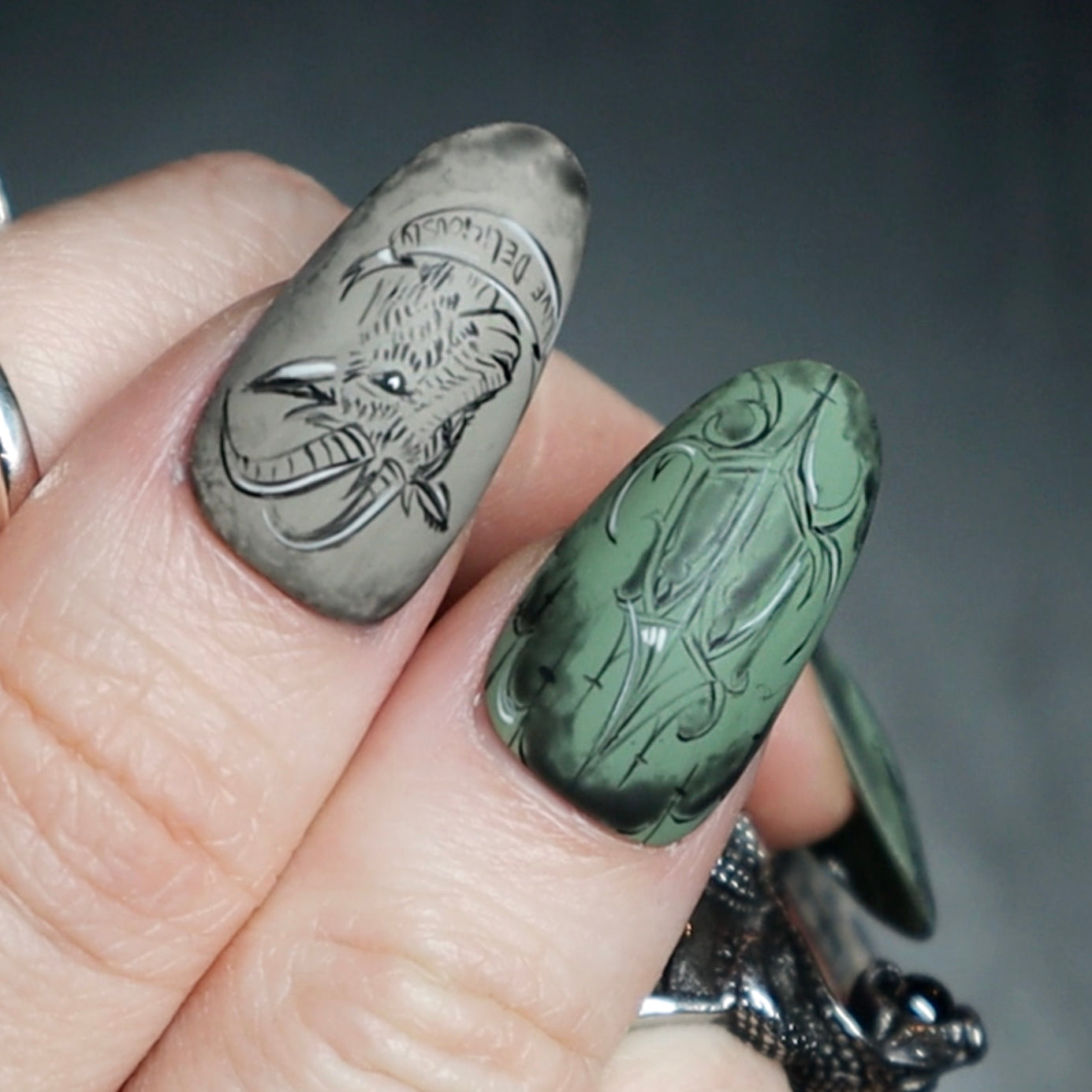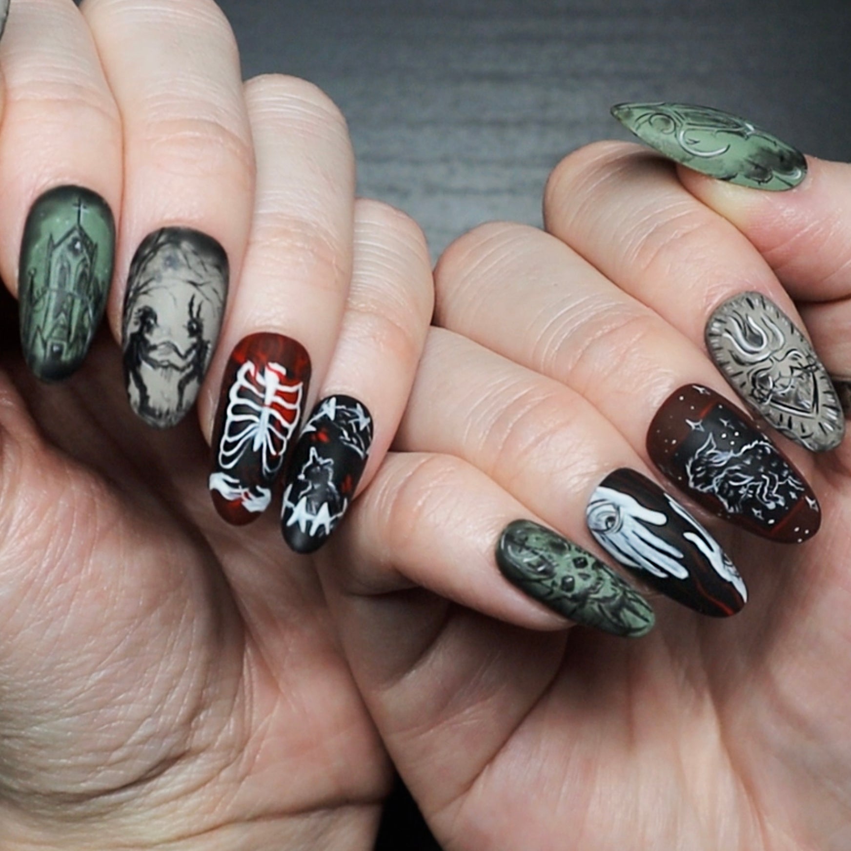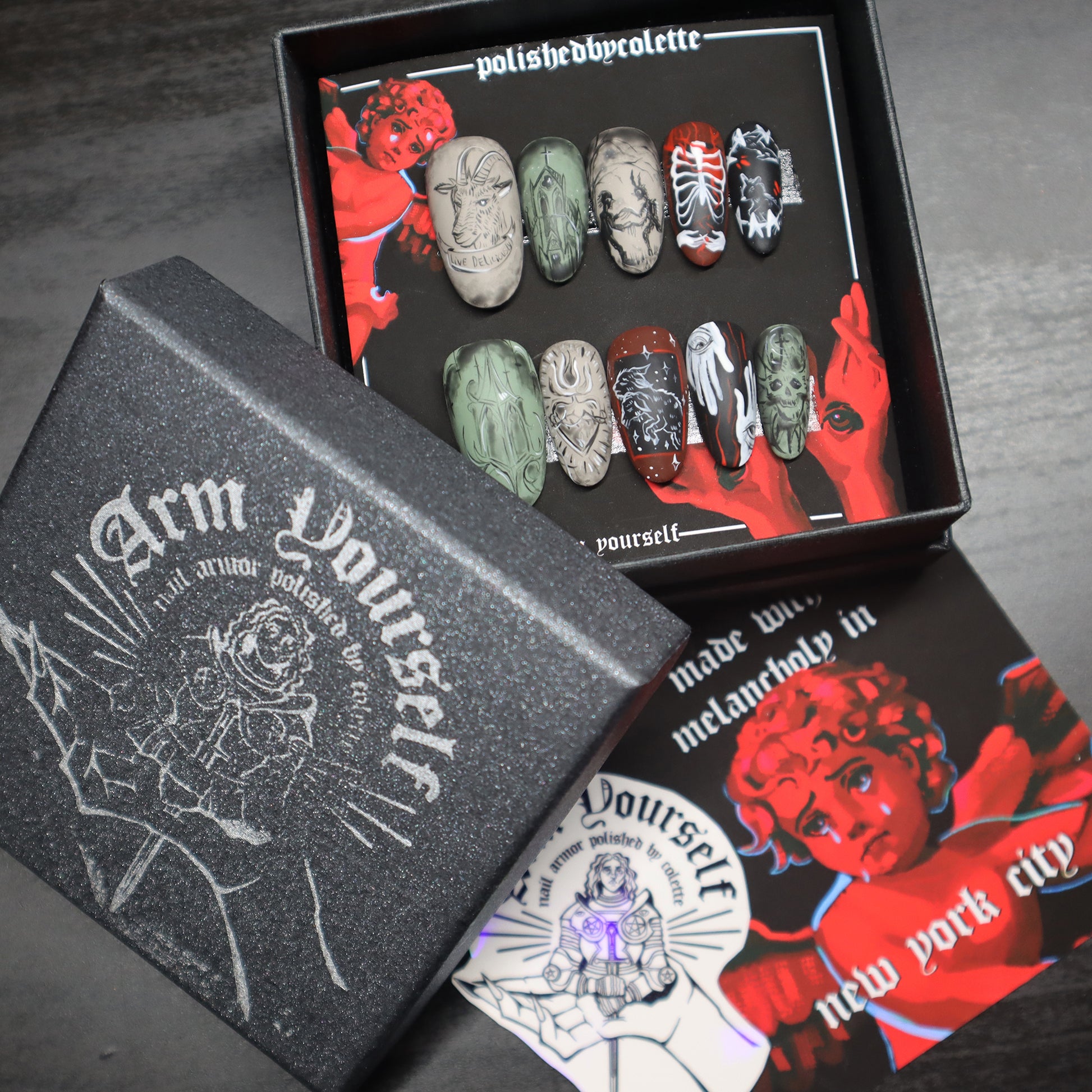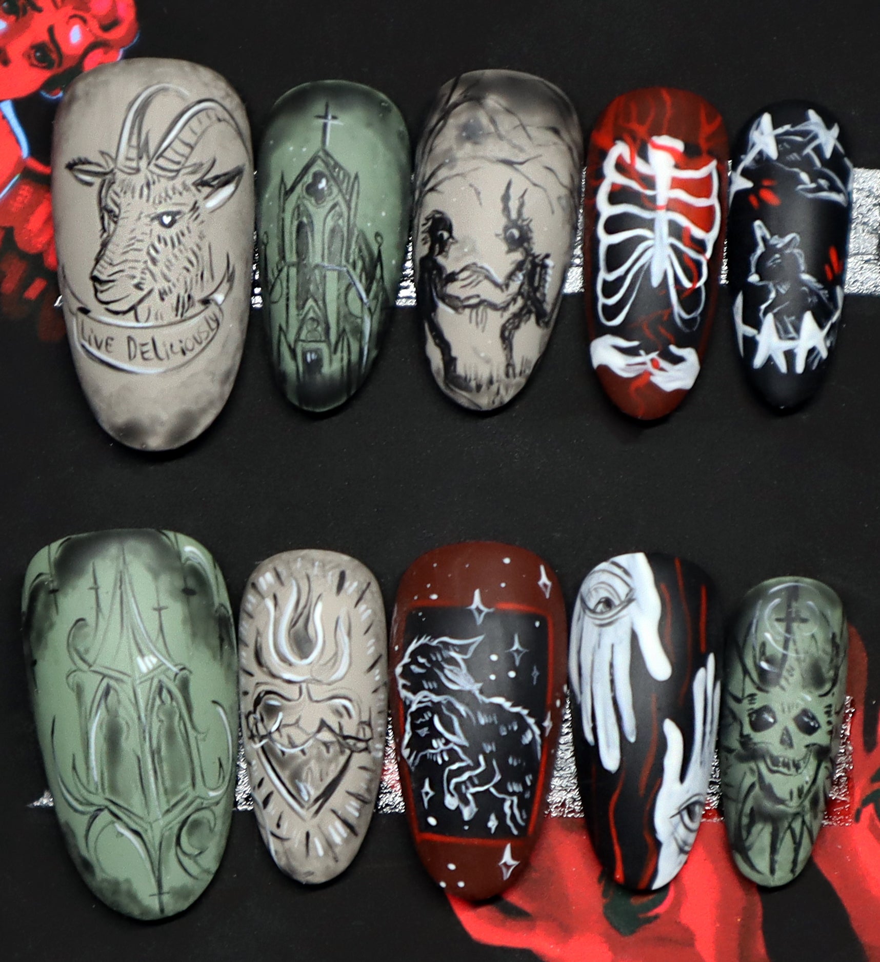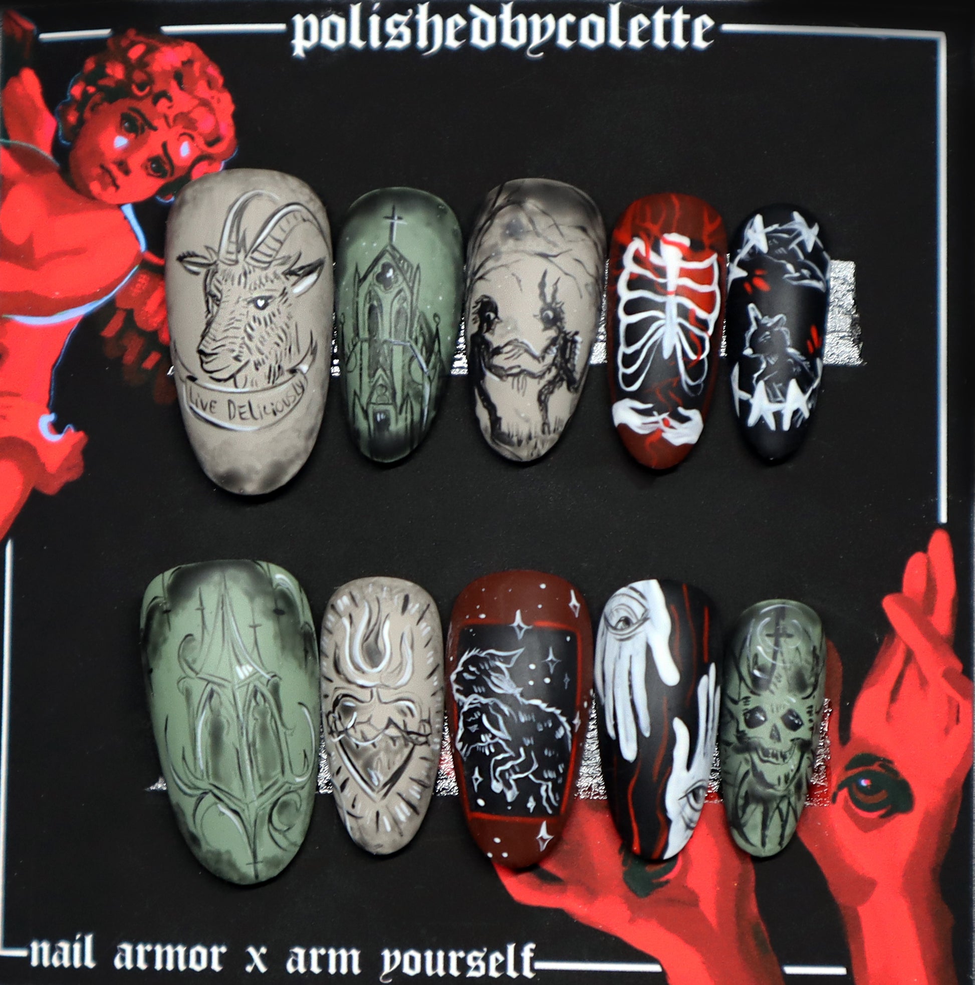 10 hand painted press on nails featuring horror, biblical and grunge artwork. these nails are reusable and can be worn for days or weeks at a time depending on your preference.
